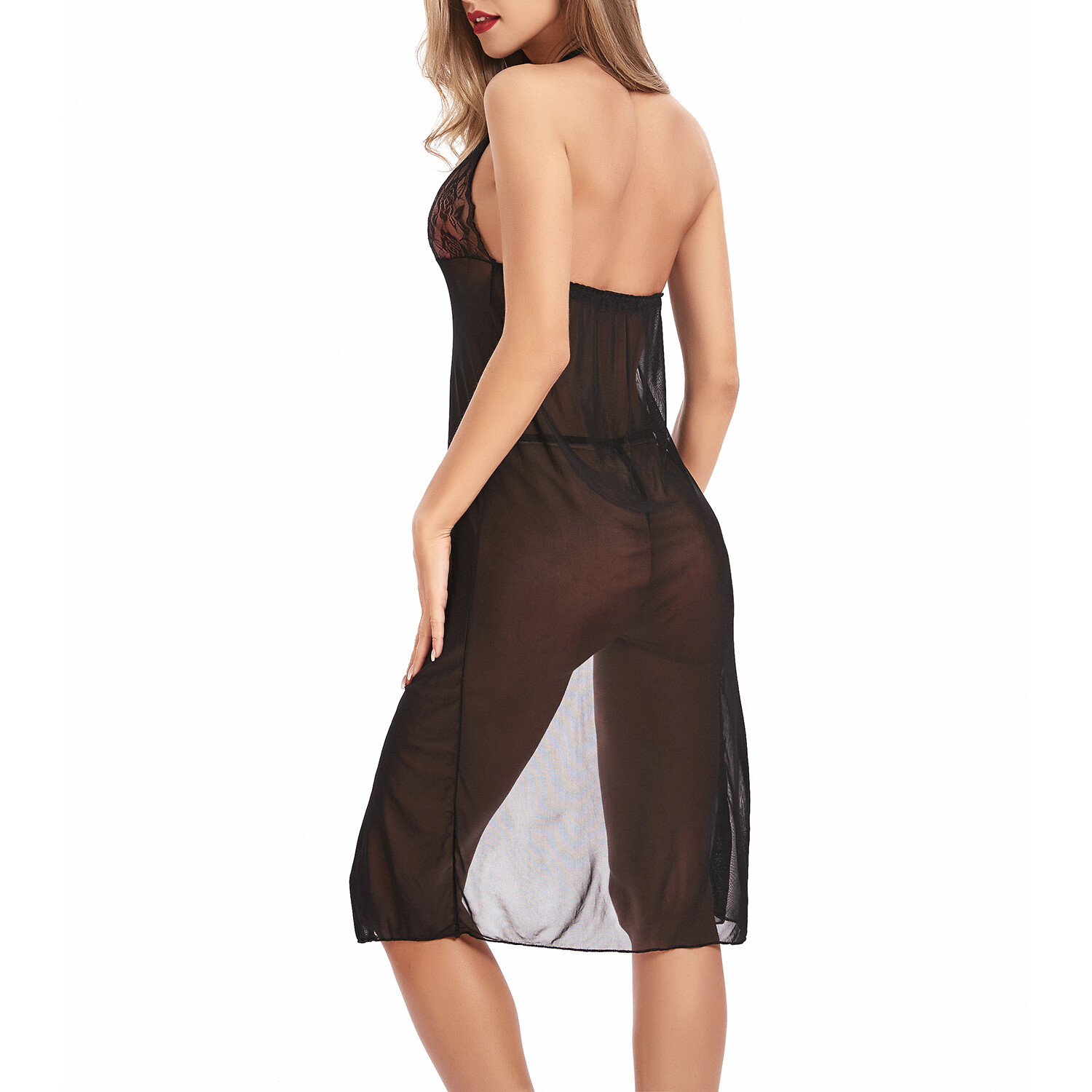 Nighty Lace Long Lingerie Set + G-String // 2-Piece Set // Black