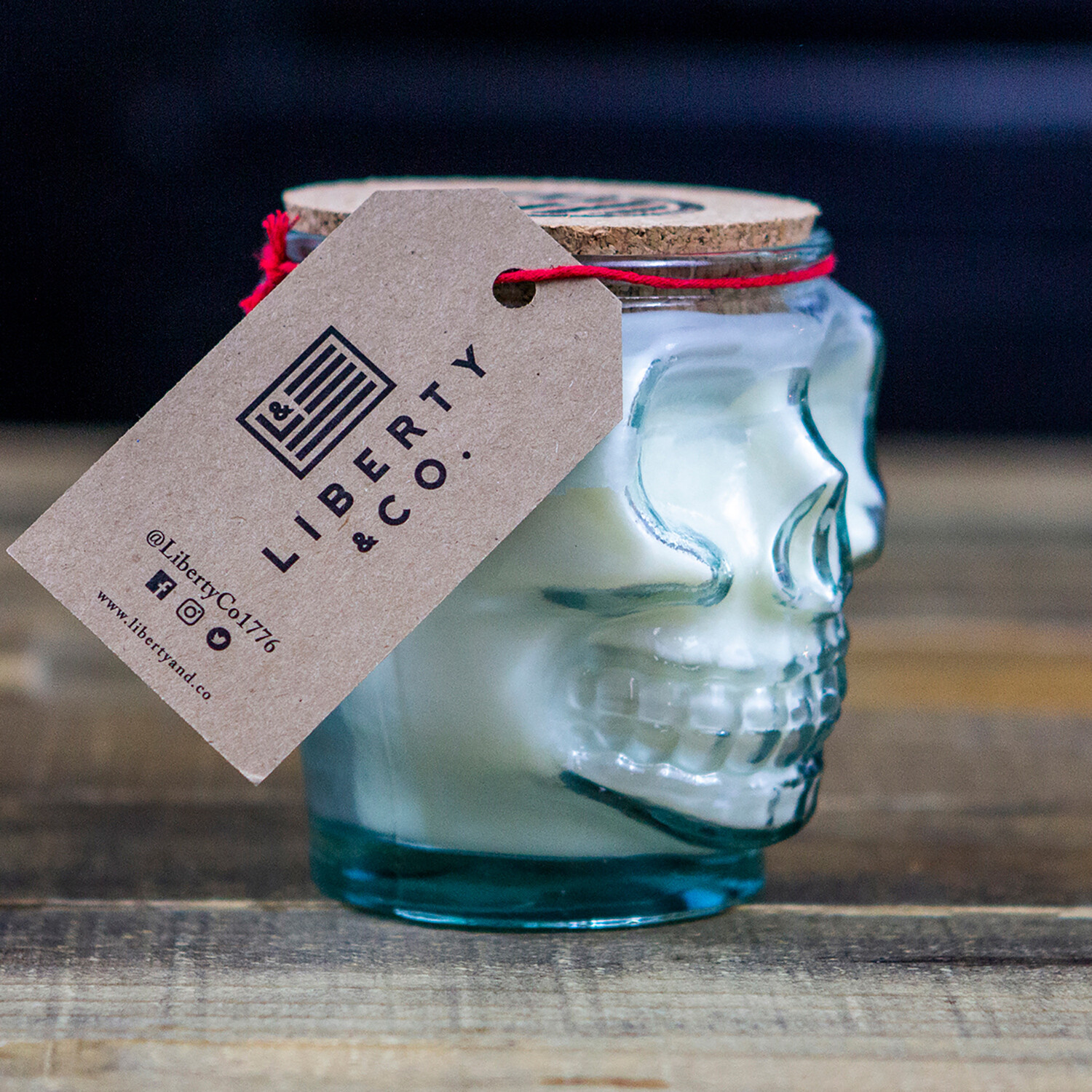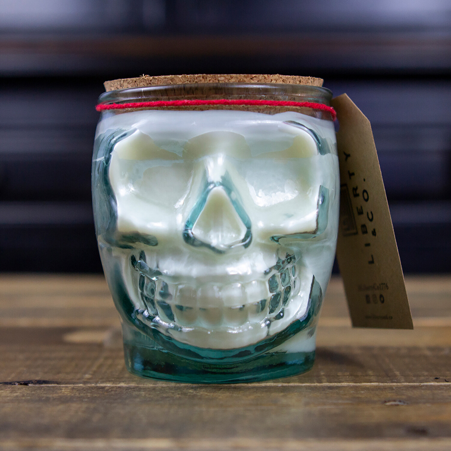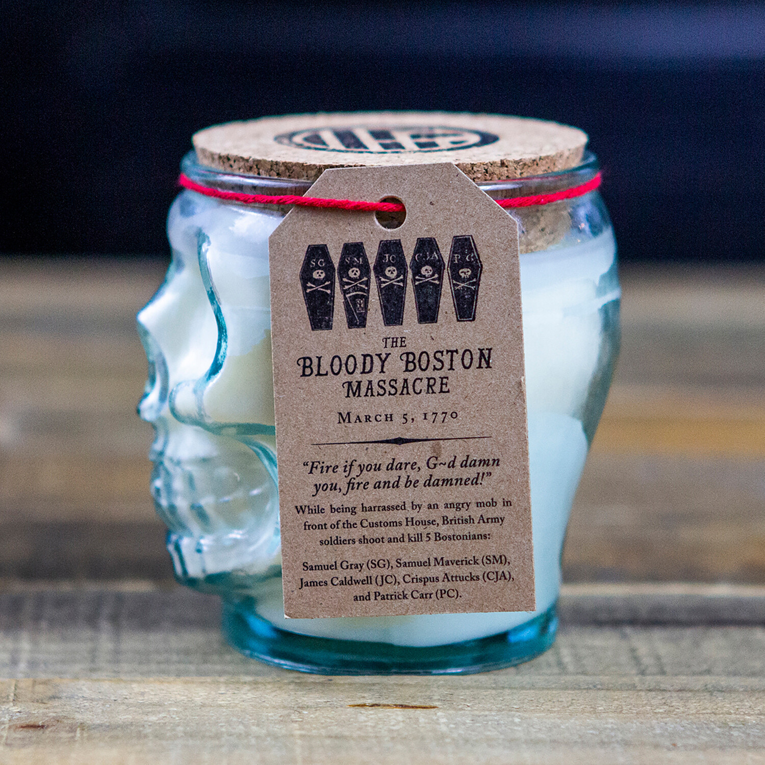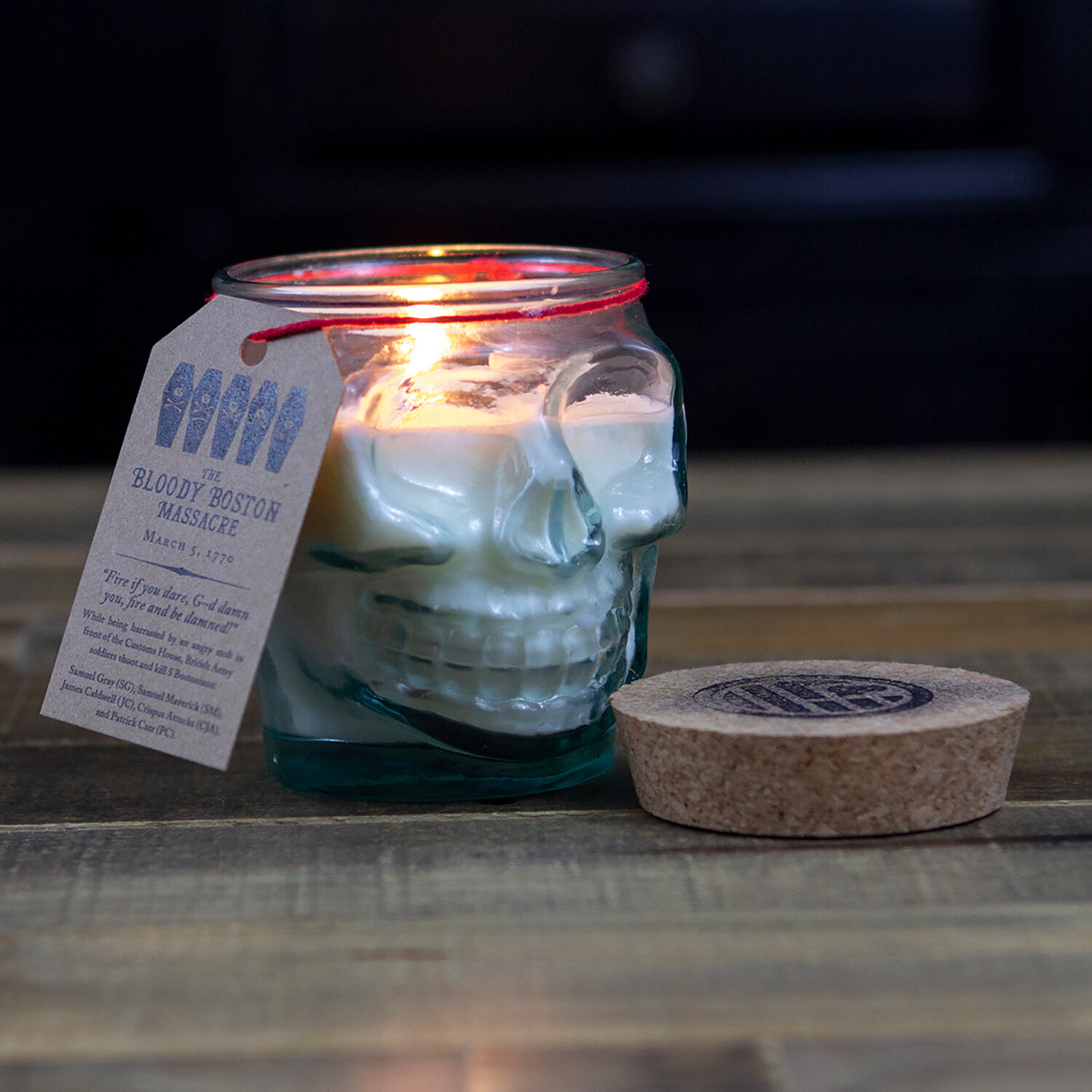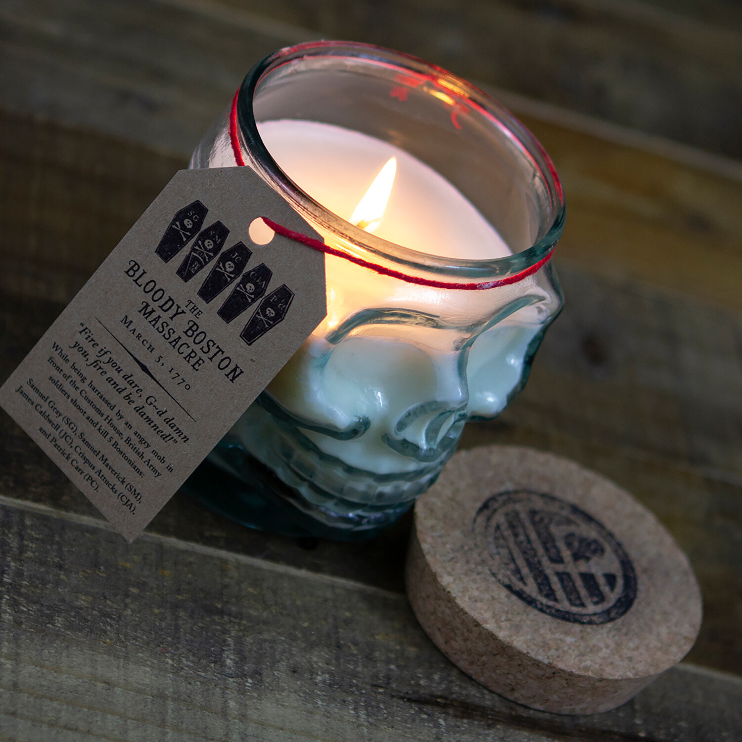 The Bloody Boston Massacre skull candle was created in remembrance of the 250th anniversary of the Boston Massacre. Skull images were prevalent up through the 19th century to denote death This candle, with hints of smokey musket fire and a warm vanilla base, is sure to be a coffee table conversation starter.