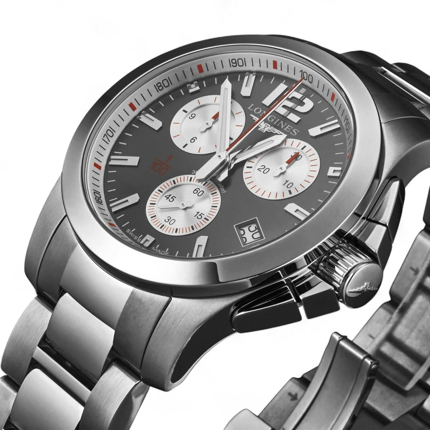 Subdials: Red large central hand seconds counter, Central 1/100th seconds counter, 30 minute counter sub-dial located at the 3 o'clock position, 12 hour counter sub-dial located at the 9 o'clock position, Small continuous running seconds hand sub-dial located at the 6 o'clock position.
