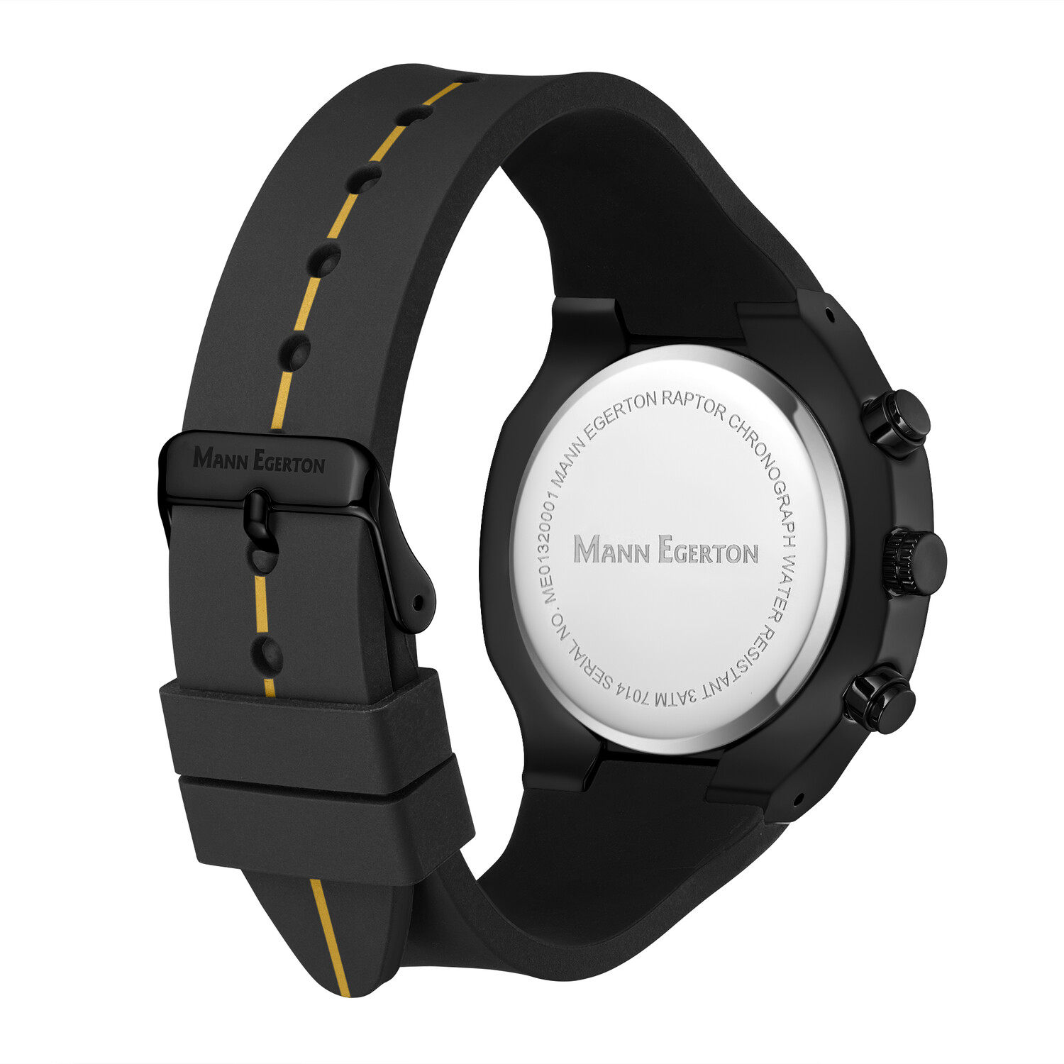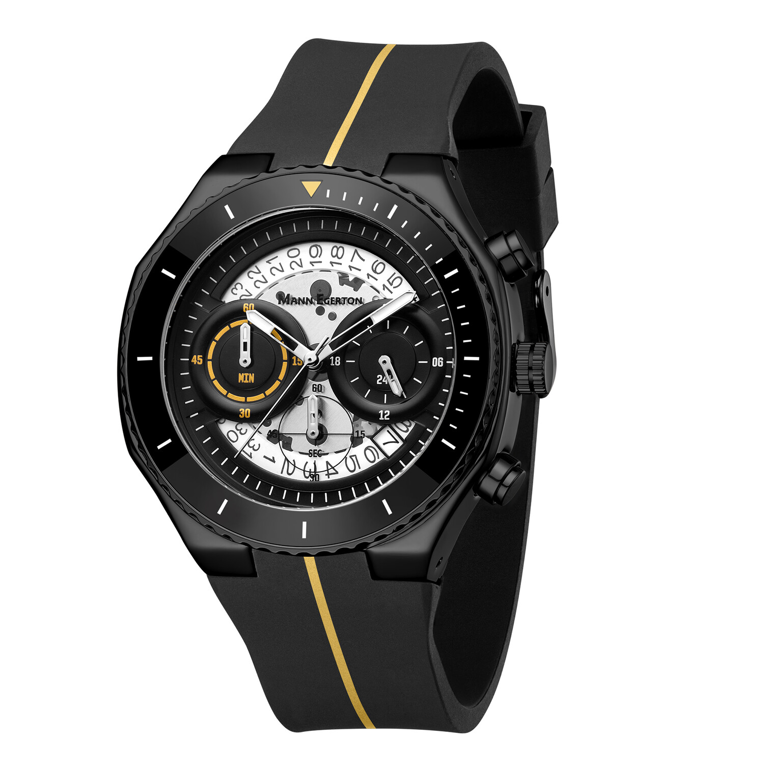 A Mann Egerton logo-engraved stainless steel caseback serves as a subtle nod to its aviation origins. The black silicone strap, cut through by a striking sunset-red line, brings contrast and a sense of vital movement. The timepiece brings past and present into focus, offering a bold interpretation of Mann Egerton’s engineering legacy in a distinctly modern form.