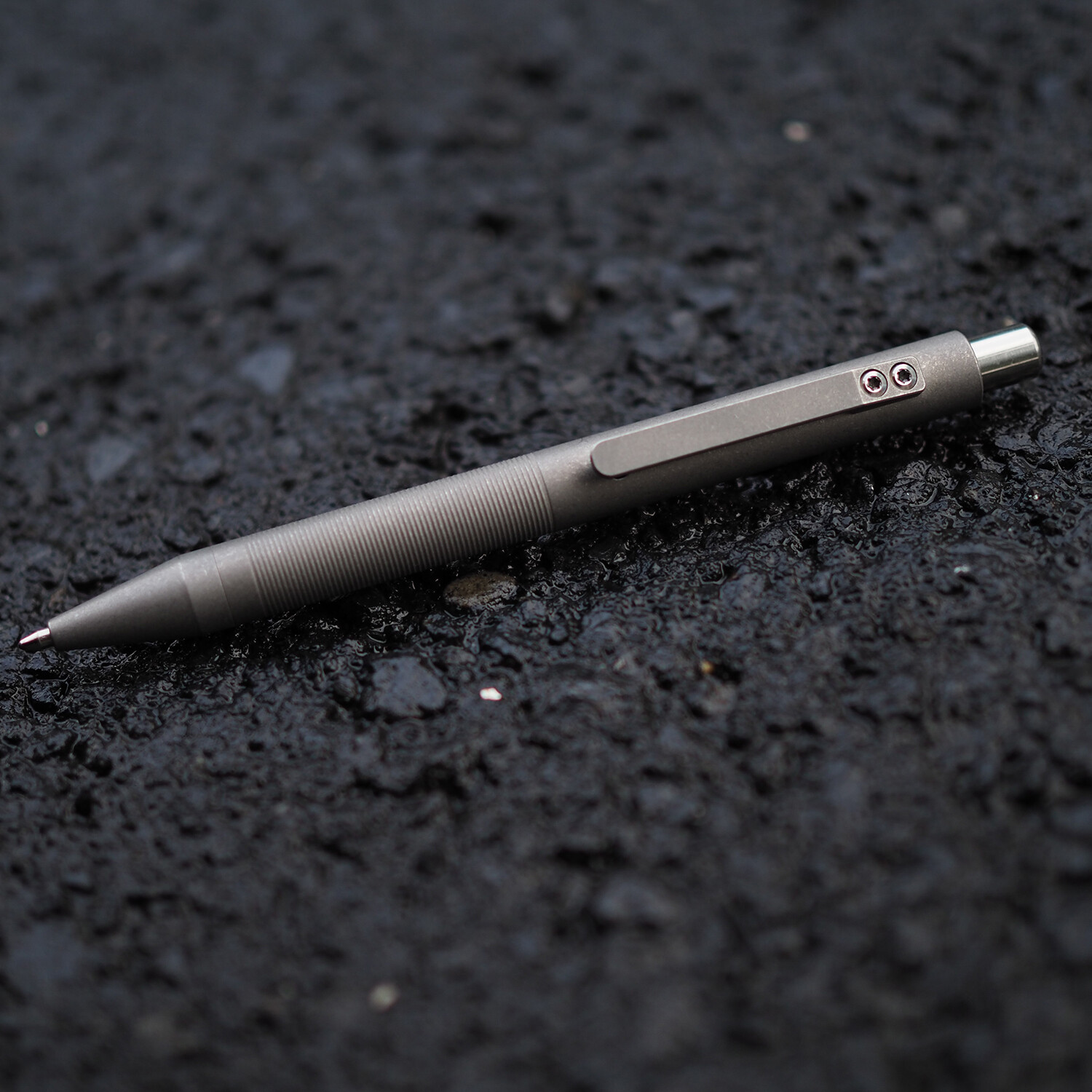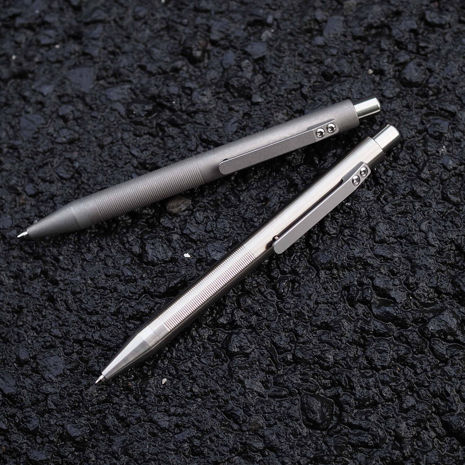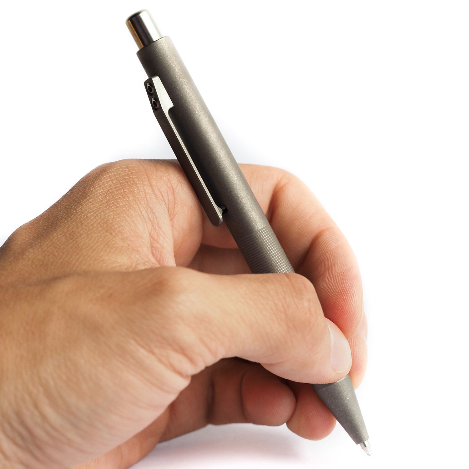 The Ti scribbler push pen is a 22g aerospace grade titanium alloy pen with a standard universal refill and a switch press mechanism. This pen includes a pen clip and is ideal for professionally smooth writing and everyday use.