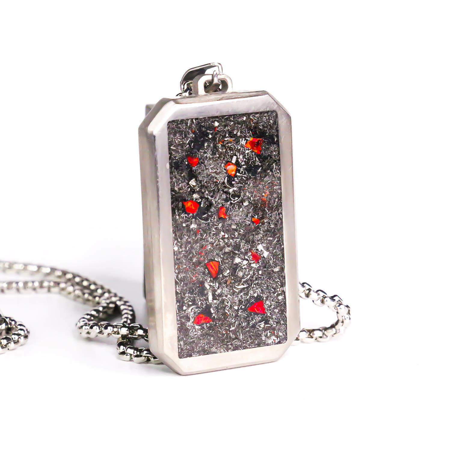 The Crimson Impact pendant is forged from opposites — the glowing intensity of red fire opal and the ancient weight of meteorite dust. Suspended in a sleek dog tag form, this piece feels like a relic from another world, grounded in cosmic history yet glowing with inner light. The red fire opal flashes with vivid ember tones, like molten stone frozen mid-burst. Fragments of genuine meteorite dust add texture and meaning — star-born remnants billions of years old, carried close to the heart.