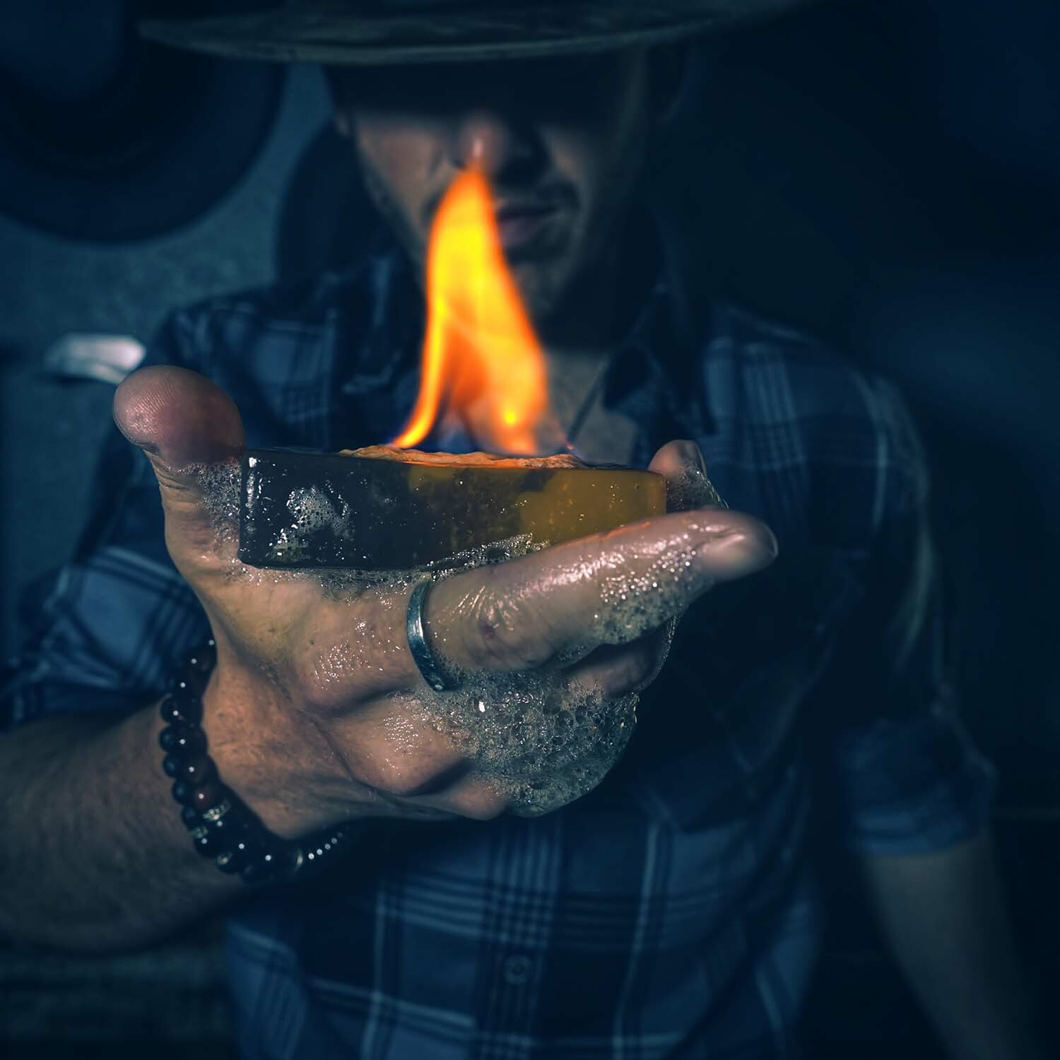 Outlaw cold-process, handmade, natural Blazing Saddles Handmade Bar Soap is made with vegan, cruelty-free, ethically sourced oils. We've picked special oils for exactly the right amount of lather and moisturizingness (is that a word? it is now!). This makes Outlaw soap both delightfully sudsy in the shower and silky smooth after the shower.