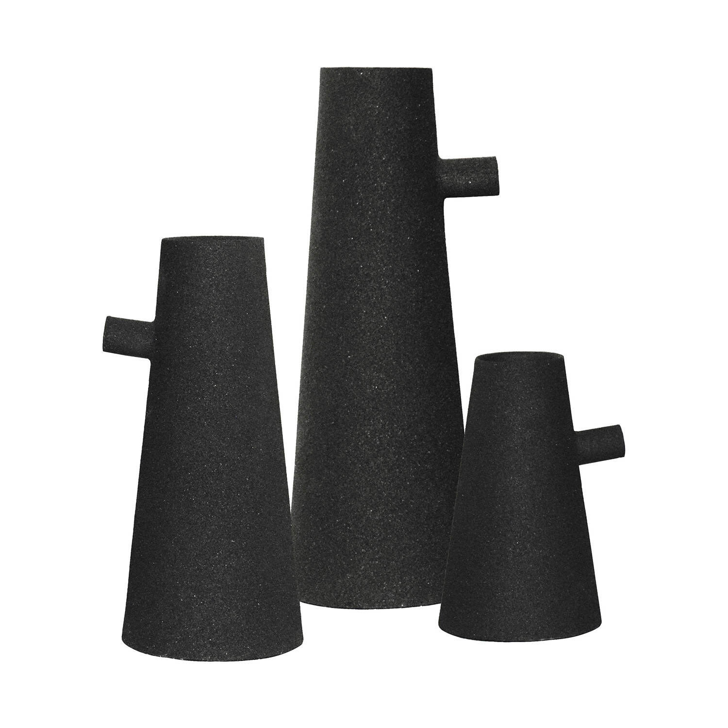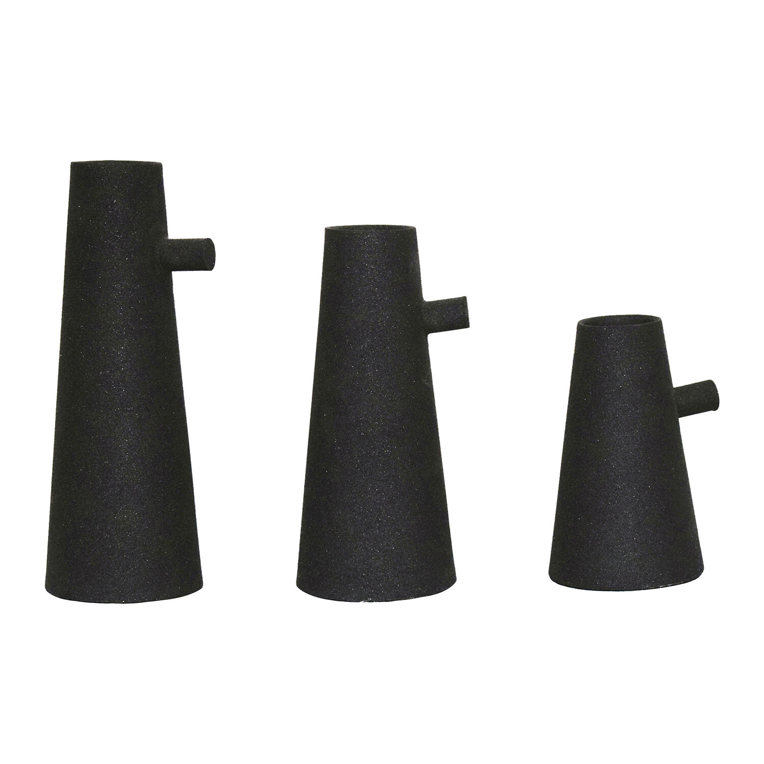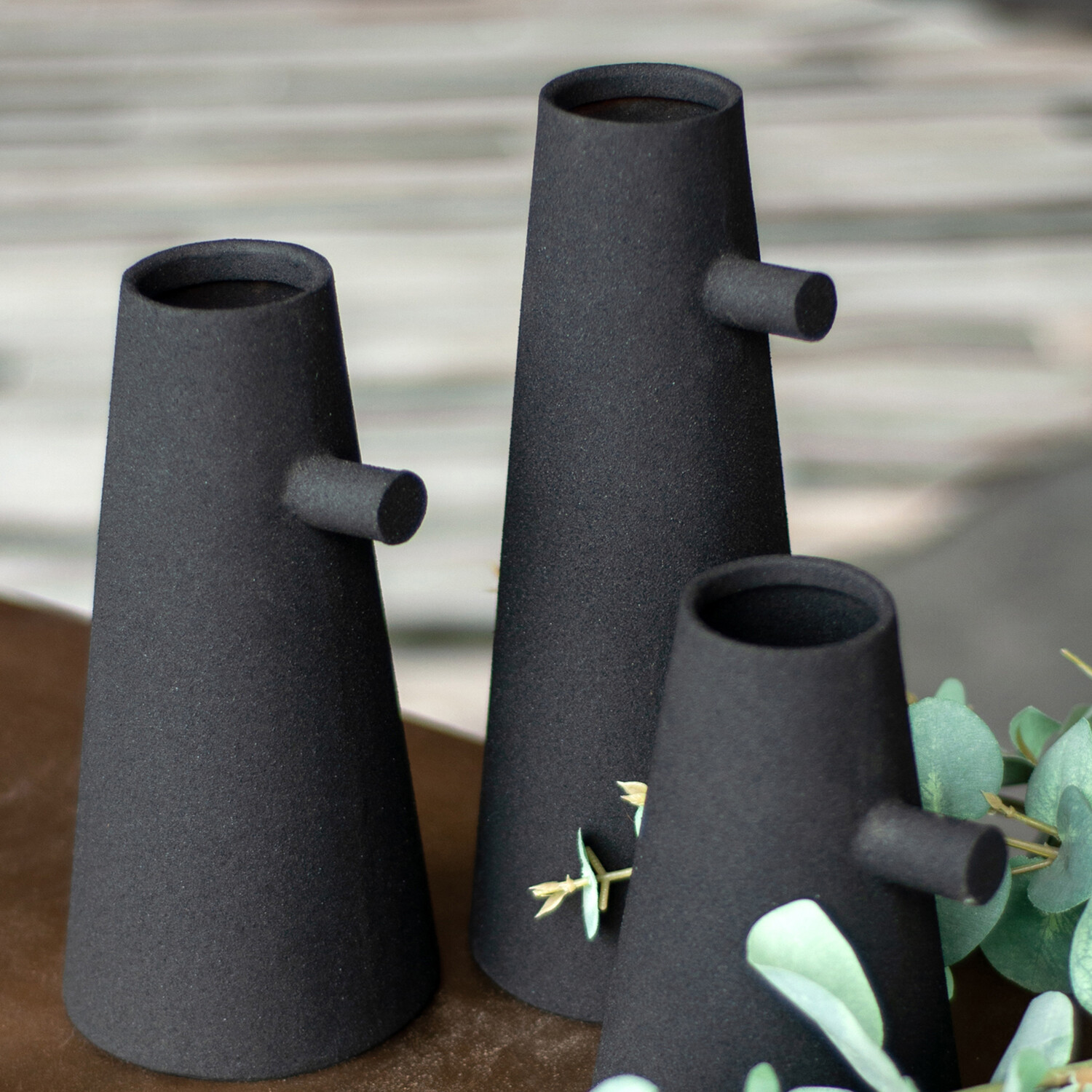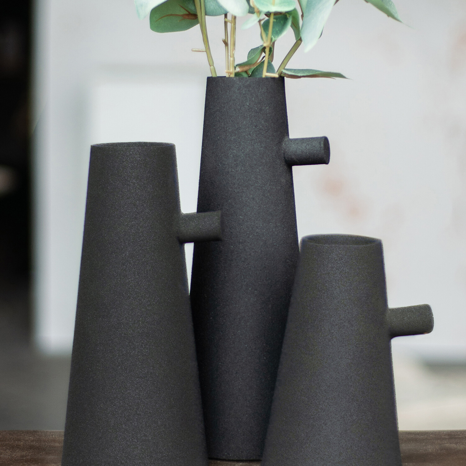 Combining organic inspiration with modern design, this set of three vases brings a designer quality to your home. Made of powder-coated iron with a texture matte black finish, the pieces feel timeless. While the vases are similar in width, each one has a different height.