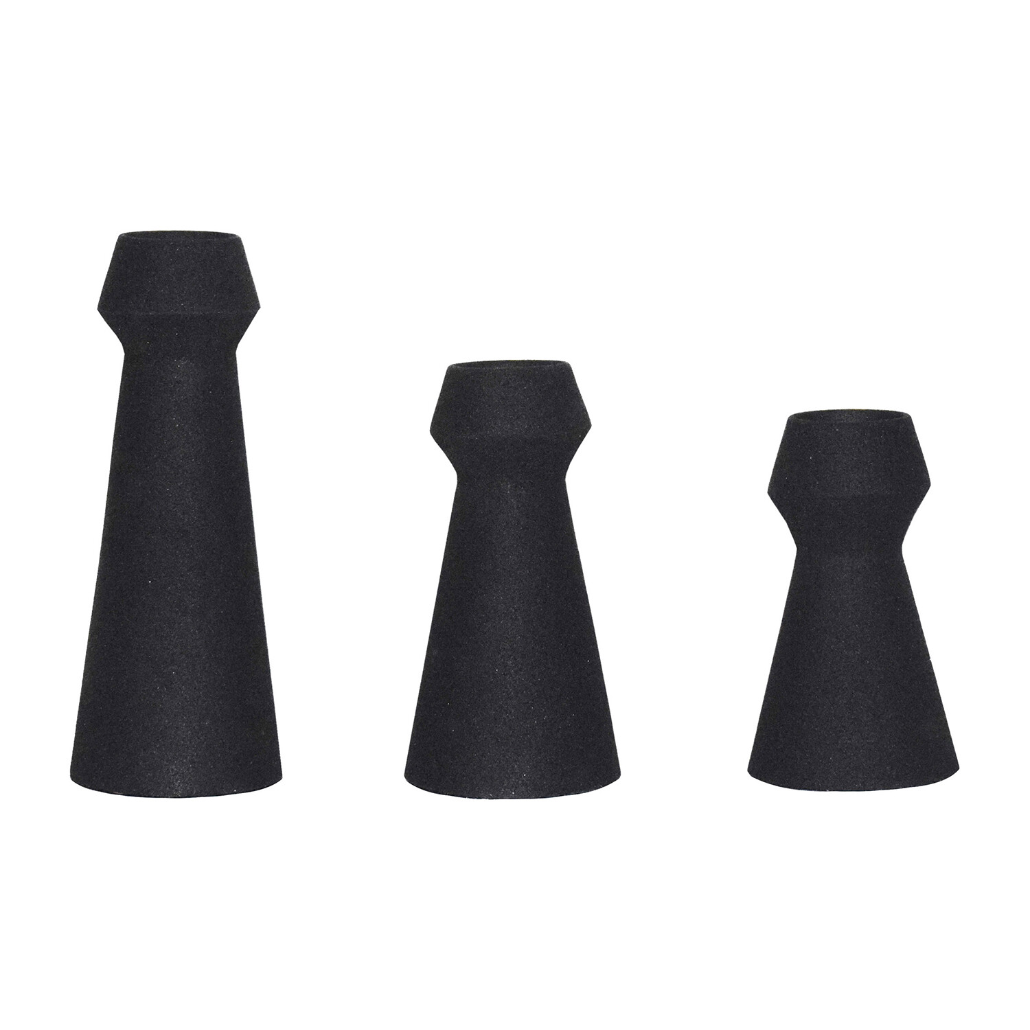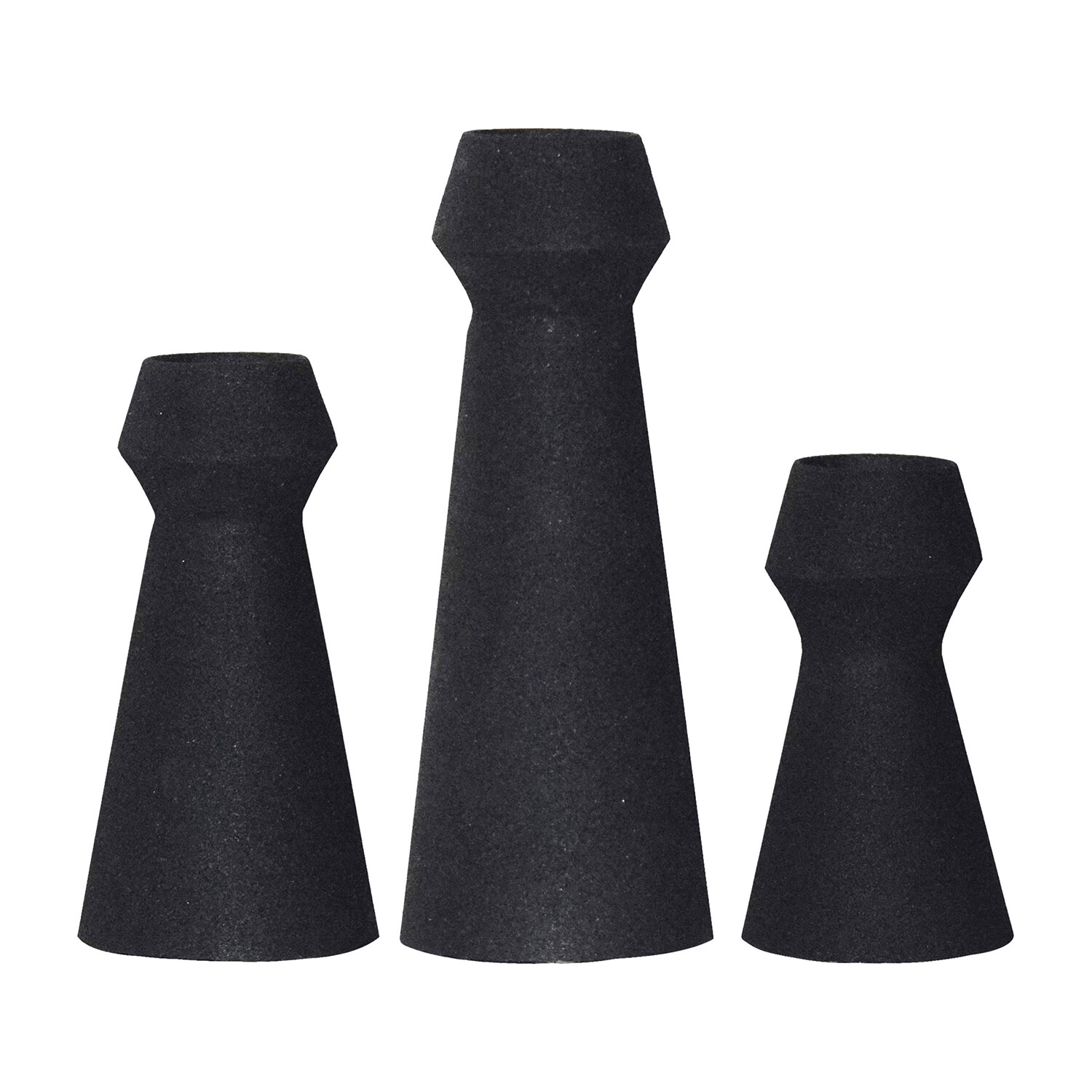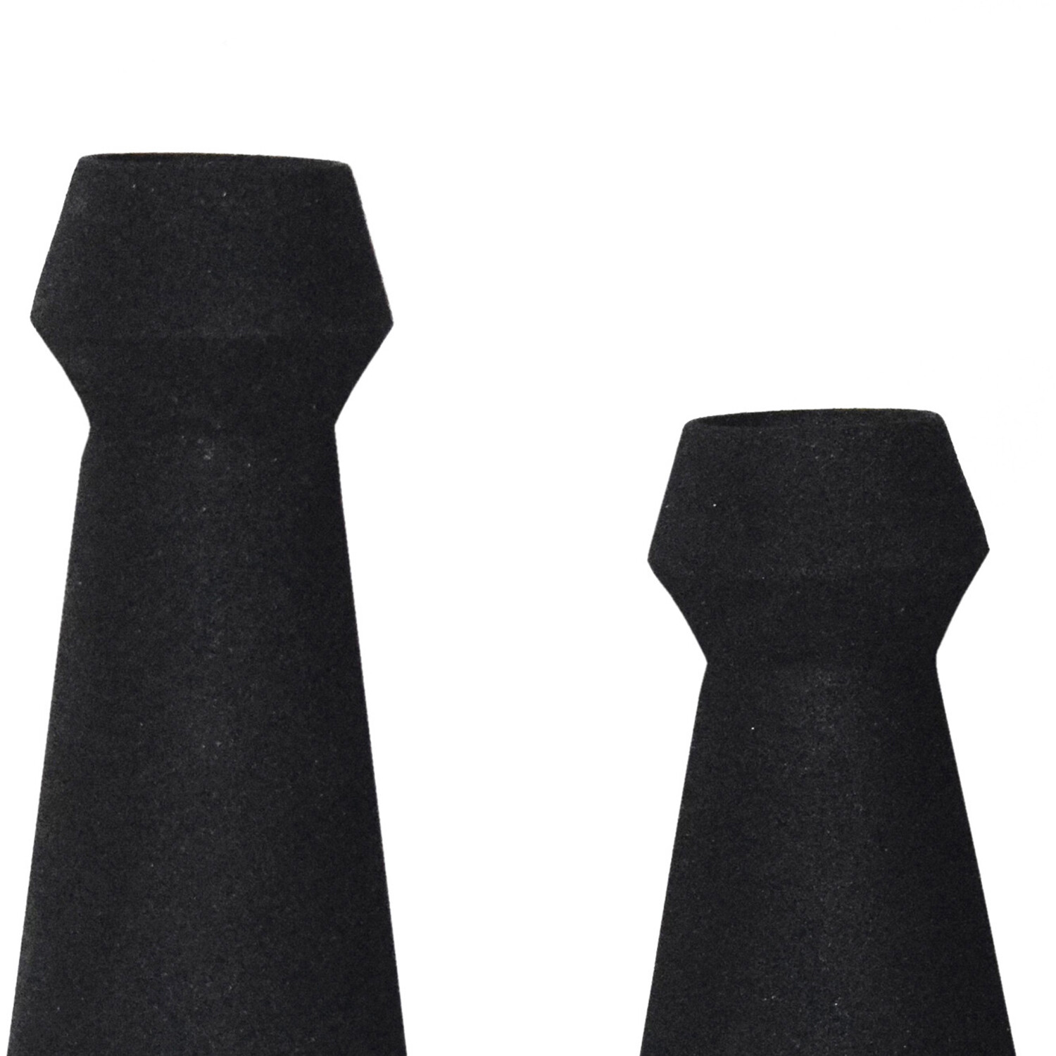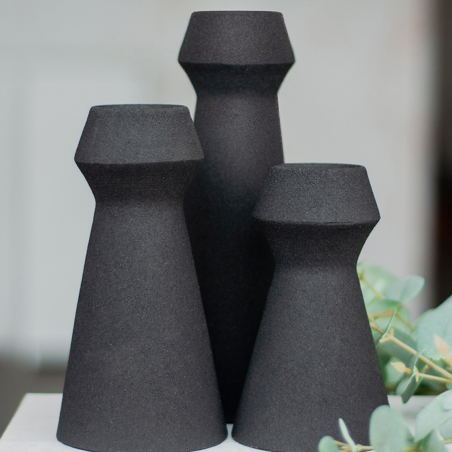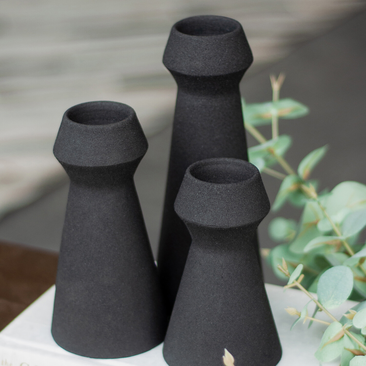 Modern art influences take the spotlight in this unique set of three vases. Place them anywhere to bring dimension and a design influence into the space. Each powder-coated iron, textured matte black piece varies slightly in height, providing endless styling opportunities.