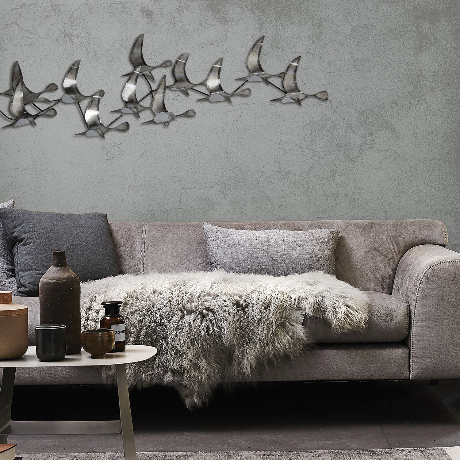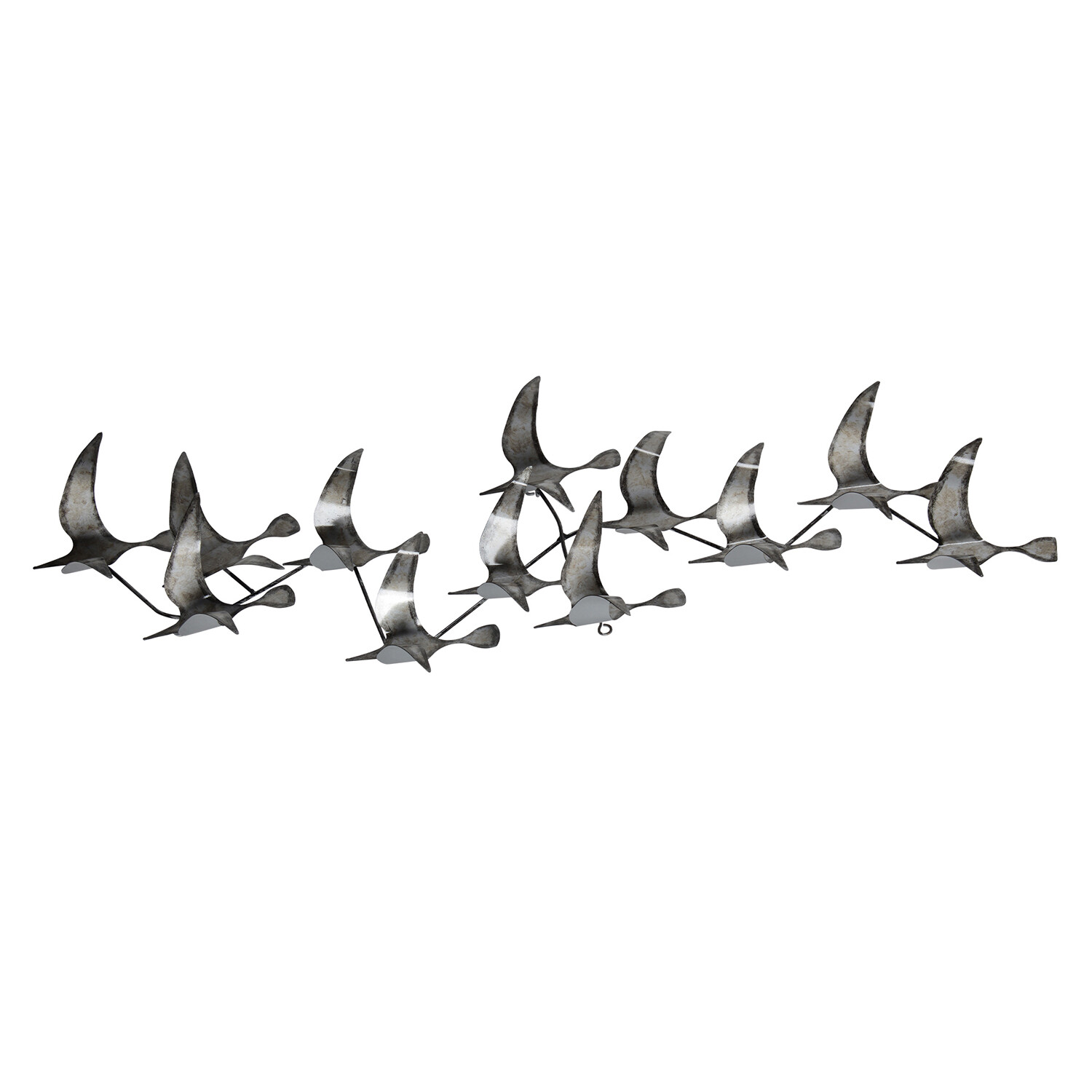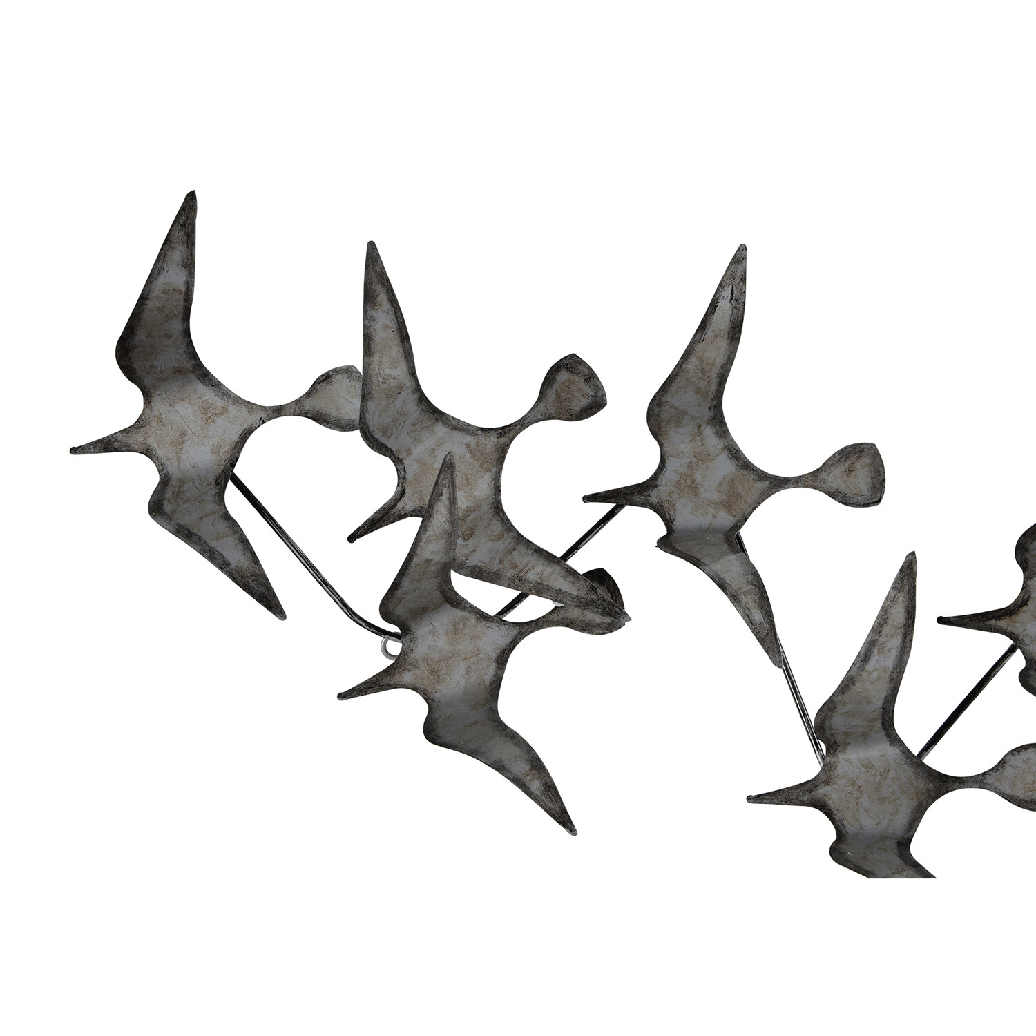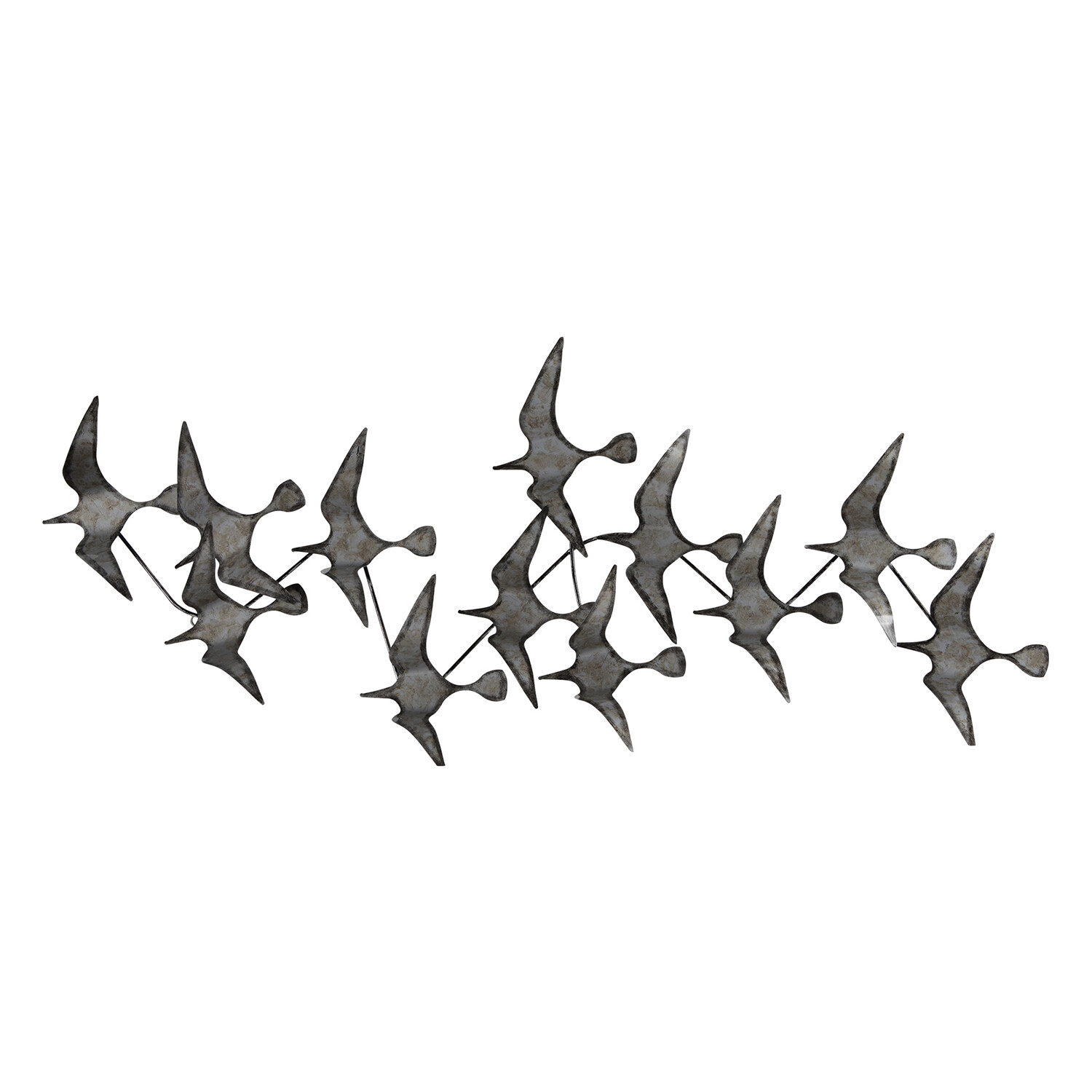 The metallic silhouette of this traditional wall decoration features a flock of birds flying in formation against an invisible wind current. Each gray bird is carefully crafted in iron and connected to the flock by a meandering iron bar that positions the avian flight pattern in place. An intriguing wall ornament to display over a fireplace or farmhouse-style headboard, the dynamic design of this decorative statue can be hung horizontally or vertically to visually expand the dimensions of your wall space.