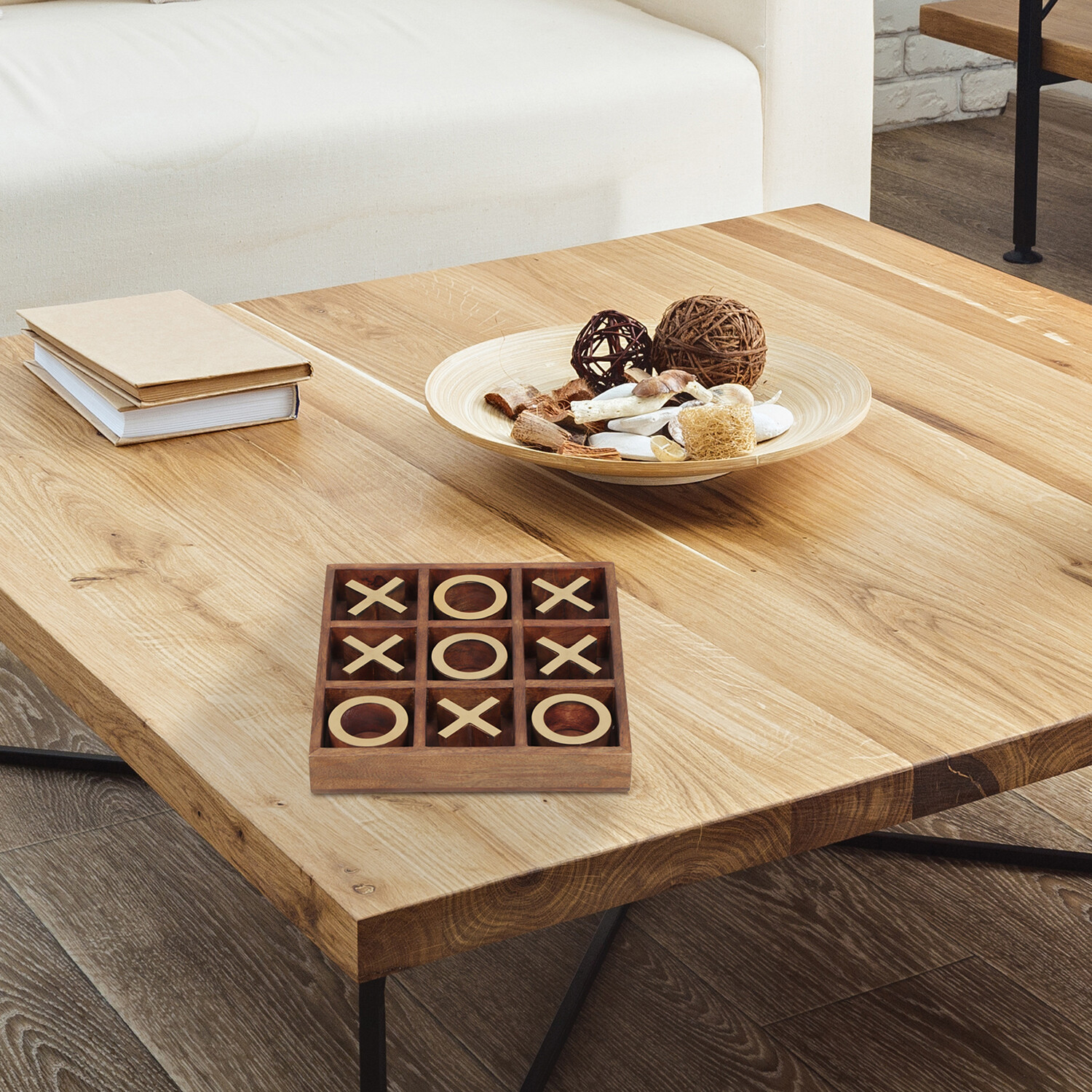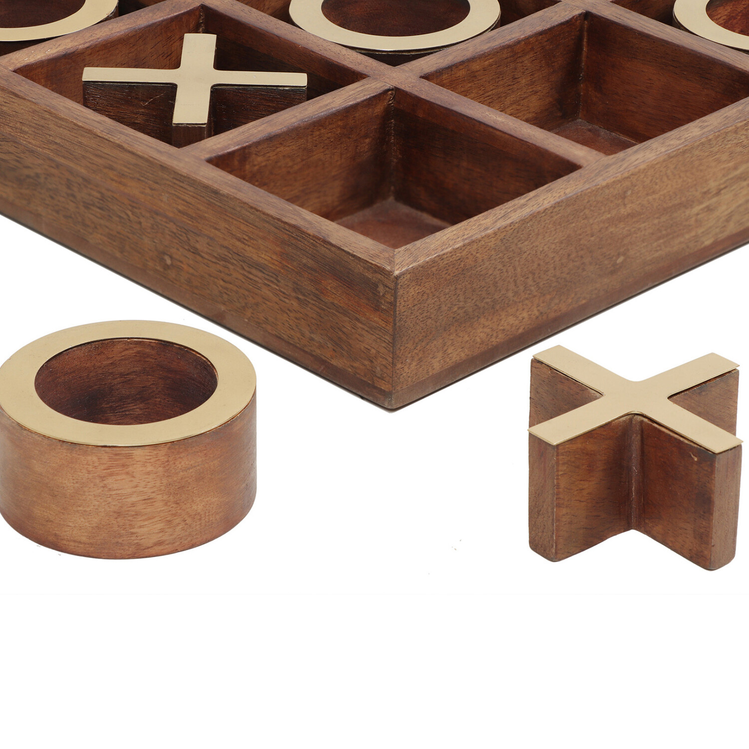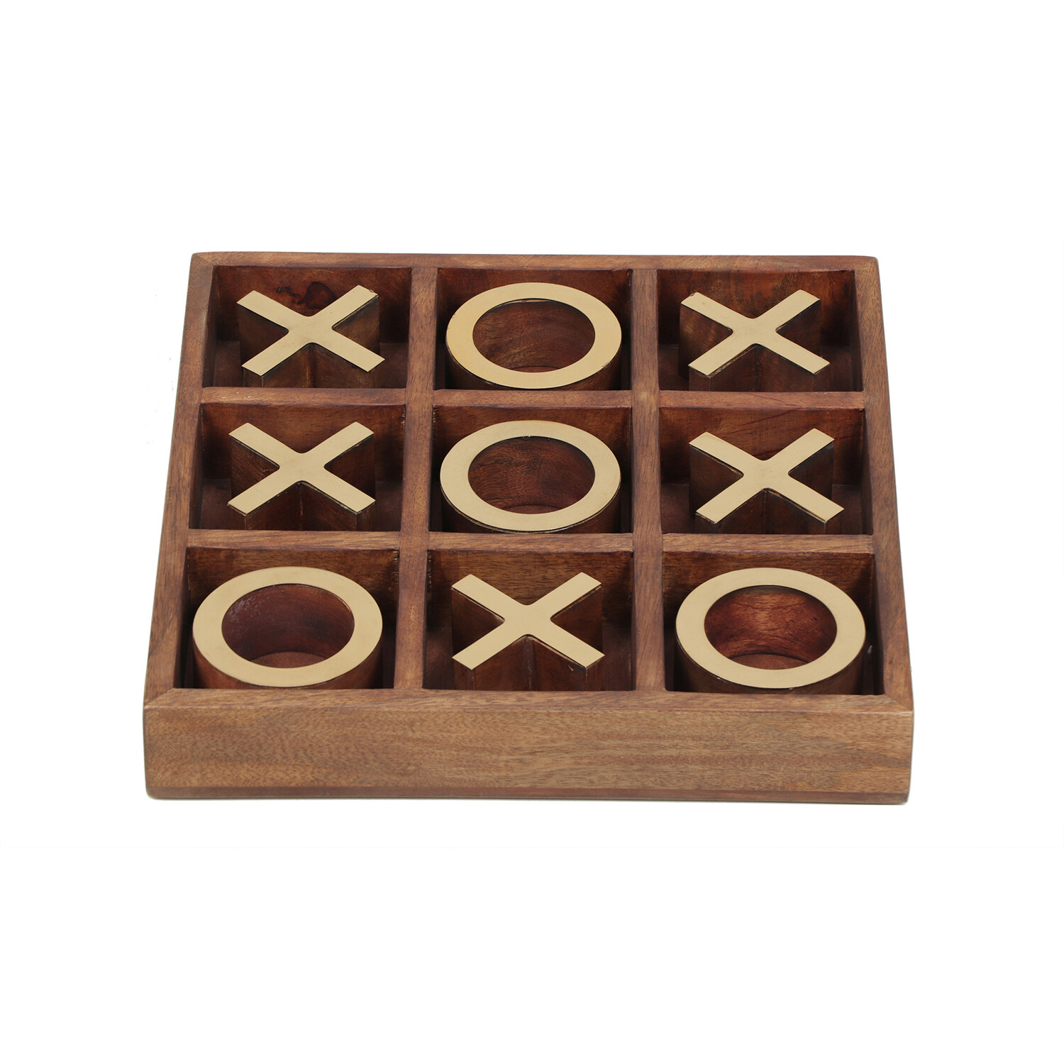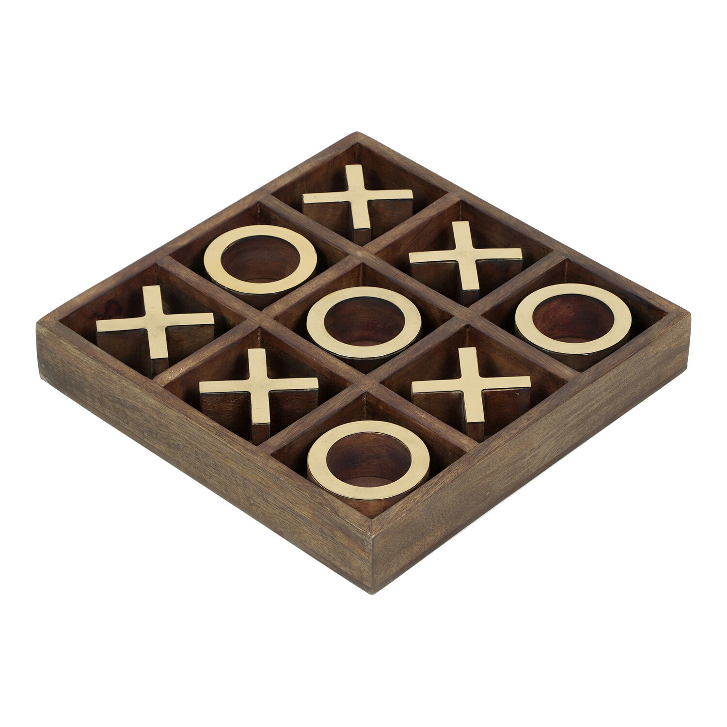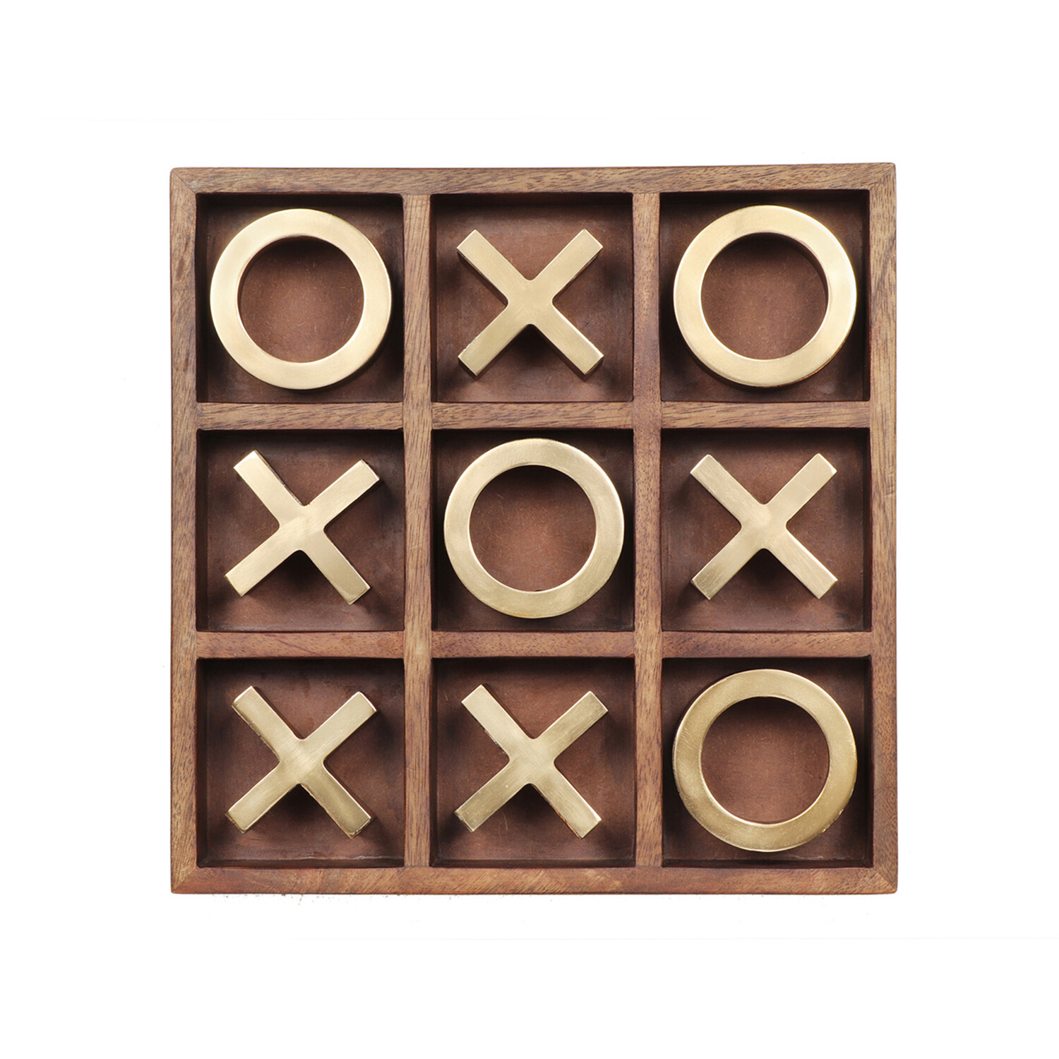 A designer’s take on the classic family game. This decorative tic-tac-toe set brings a playful vibe to a mid-century living space. Composed of natural wood and antique brass, this game holds the ideal blend of organic influence and sleek sophistication.