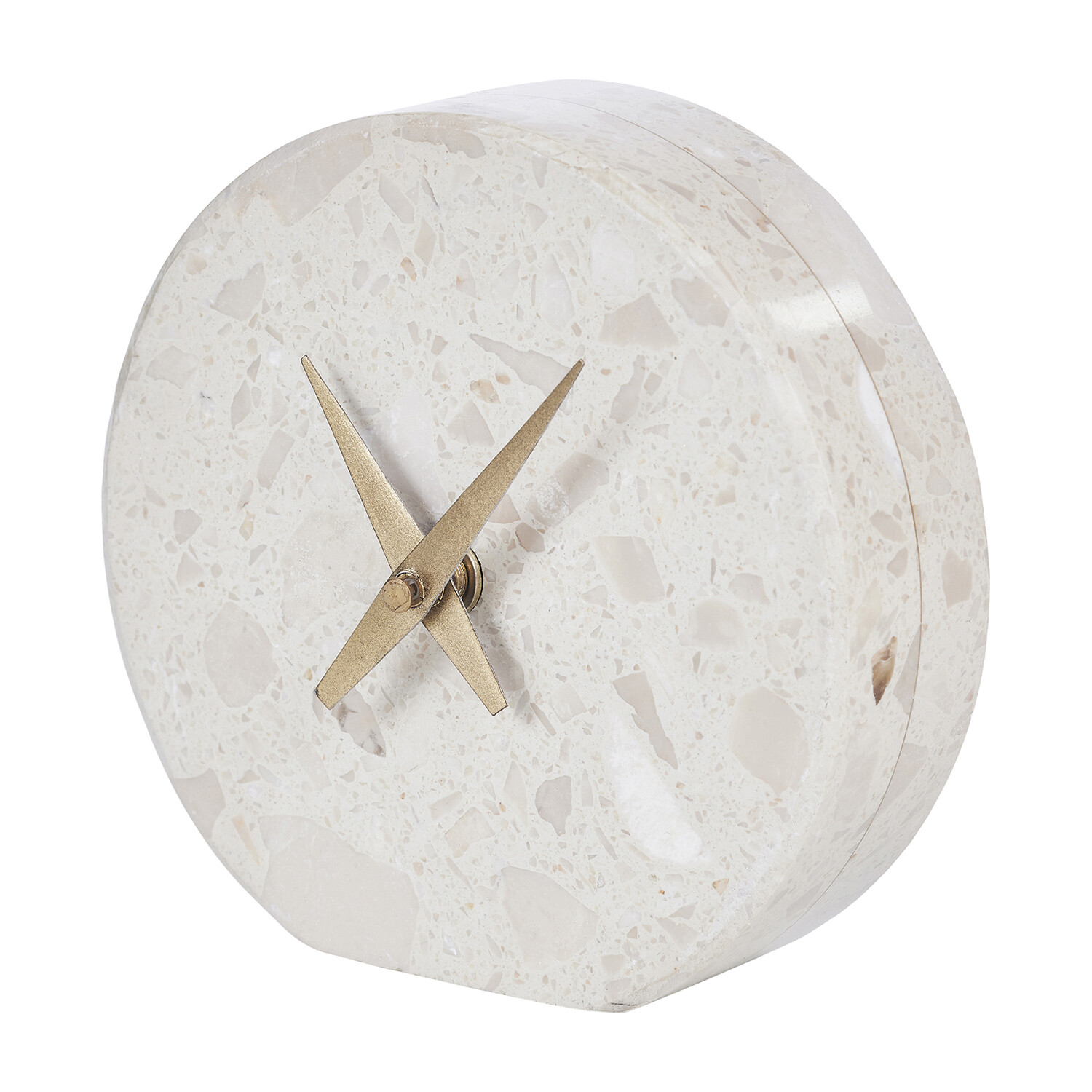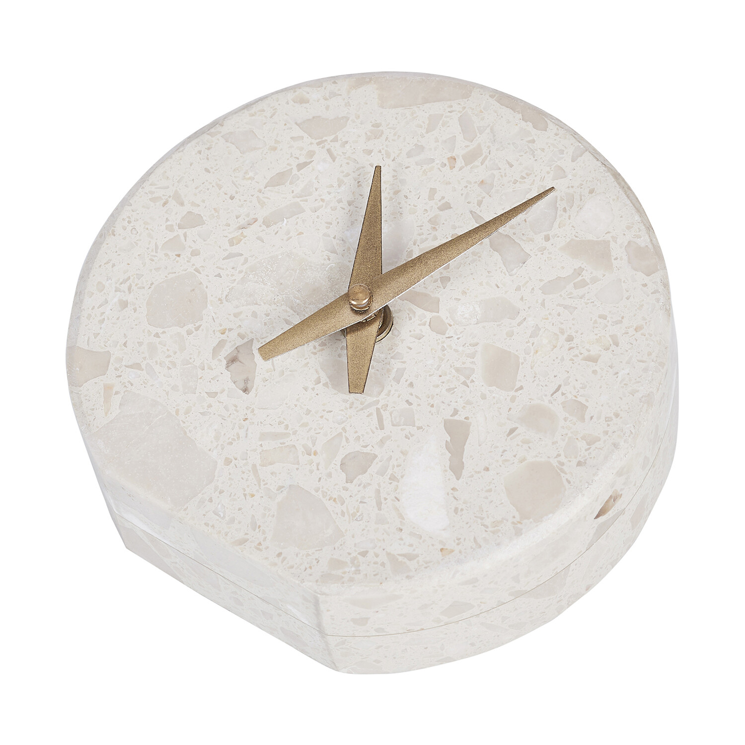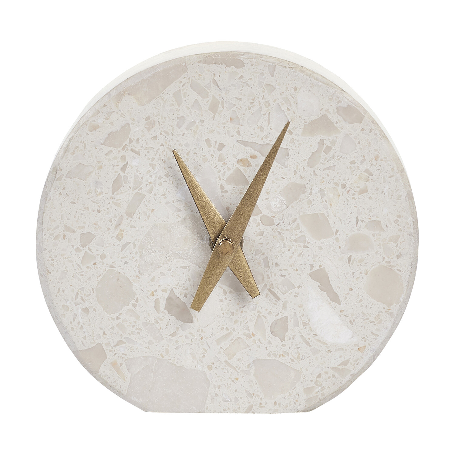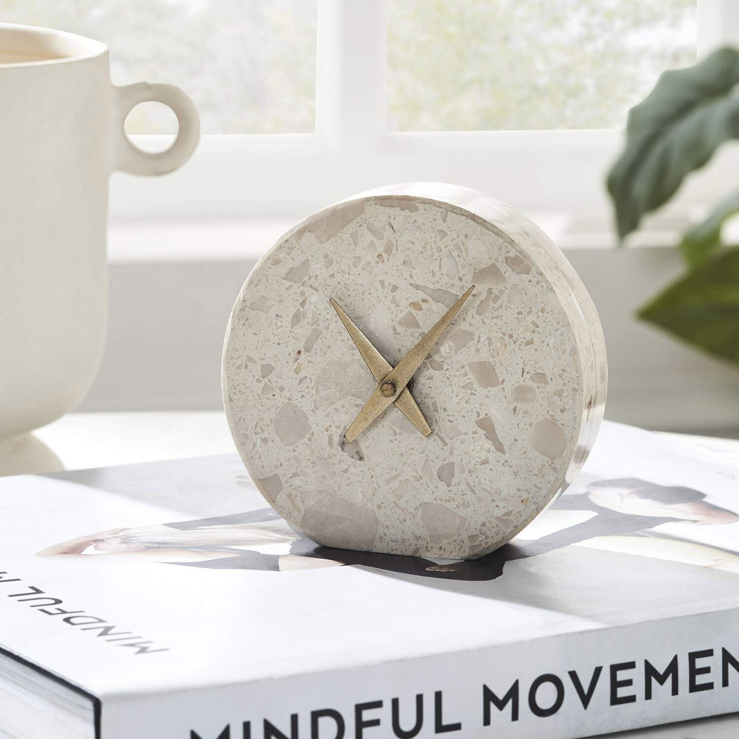Warmth and glamor radiate from this refined clock design. At 5 by 5 inches, it is small in stature, yet its influence feels grand. Featuring a blend of cream and beige engineered marble and antique brass watch hands, it holds a soft and alluring monochrome palette.