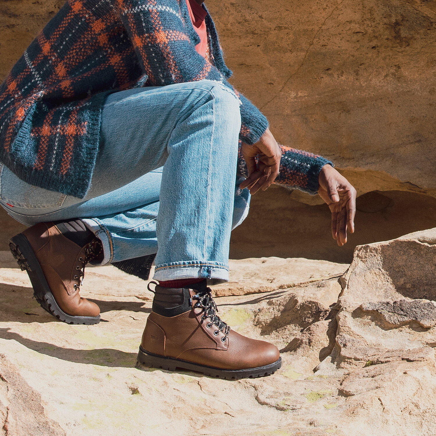 Upper: Chicory Brown Leather; Insoles: Removable Orthite Eco Hybrid, 32% Eco Content, 15% Waste Foam, 5% Recycled Content, 12% Bio Oils