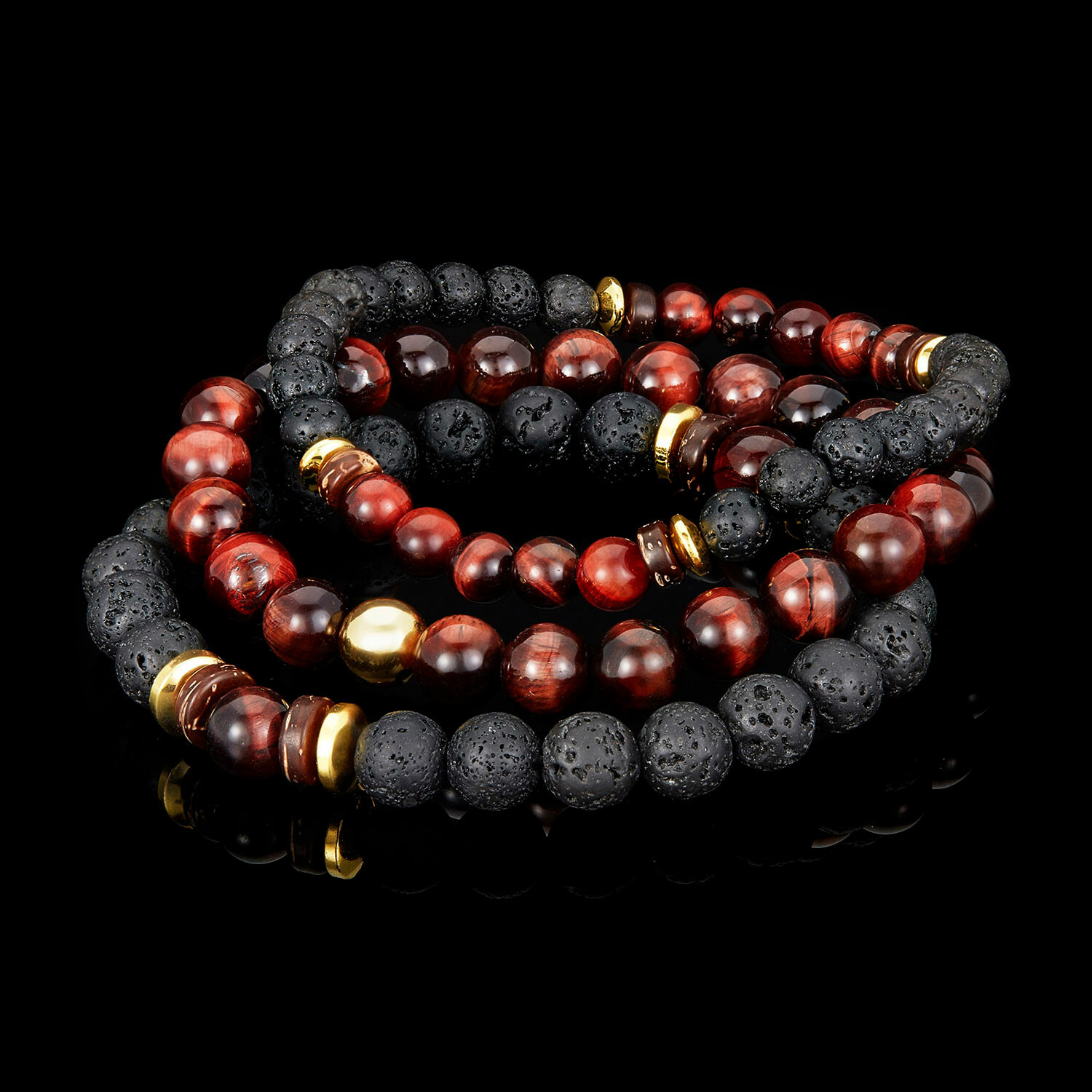 Red Tiger Eye + Gold Plated Hematite + Lava + Wood Bead Stretch Bracelets // Set of 3 // 8"