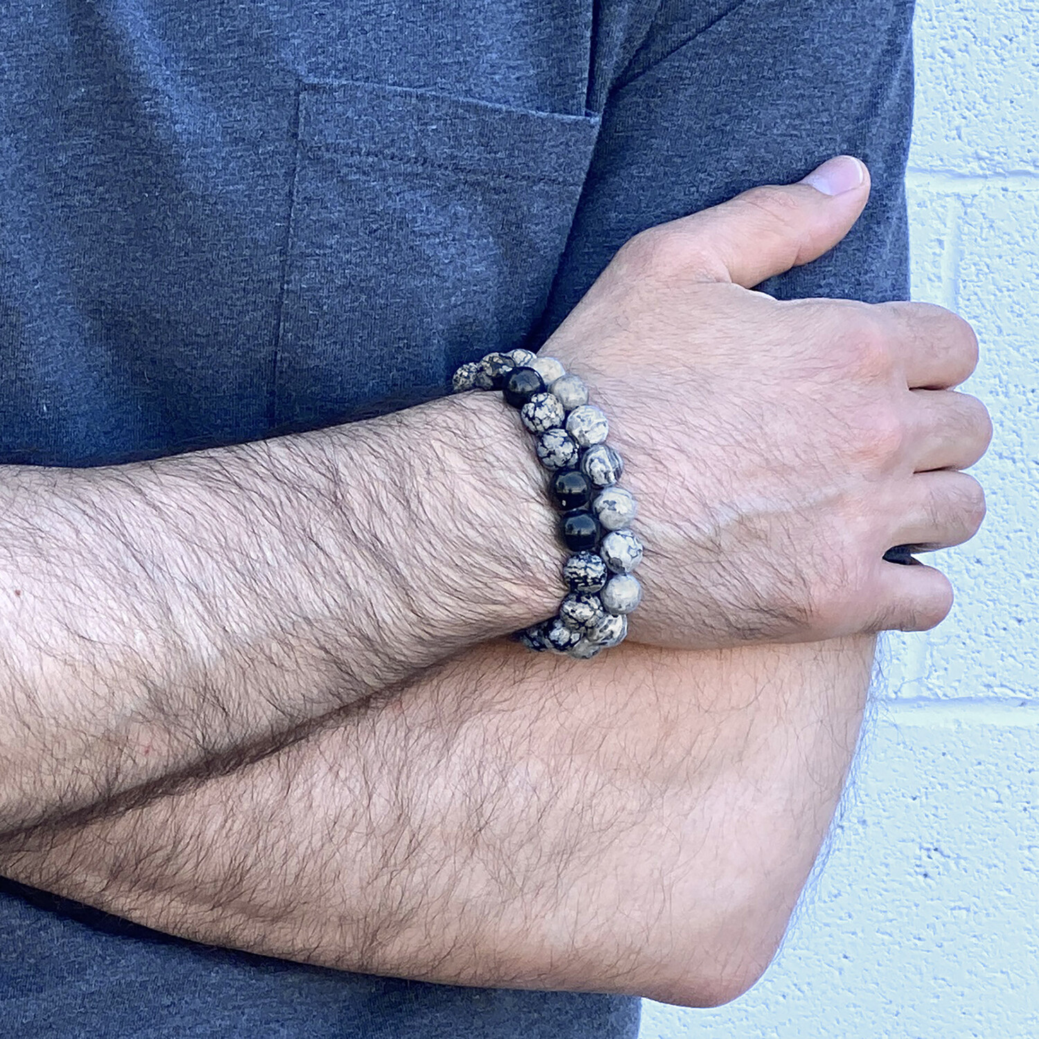 Snowflake Agate + Matte Onyx Stone Stretch Bracelet // 8.25"